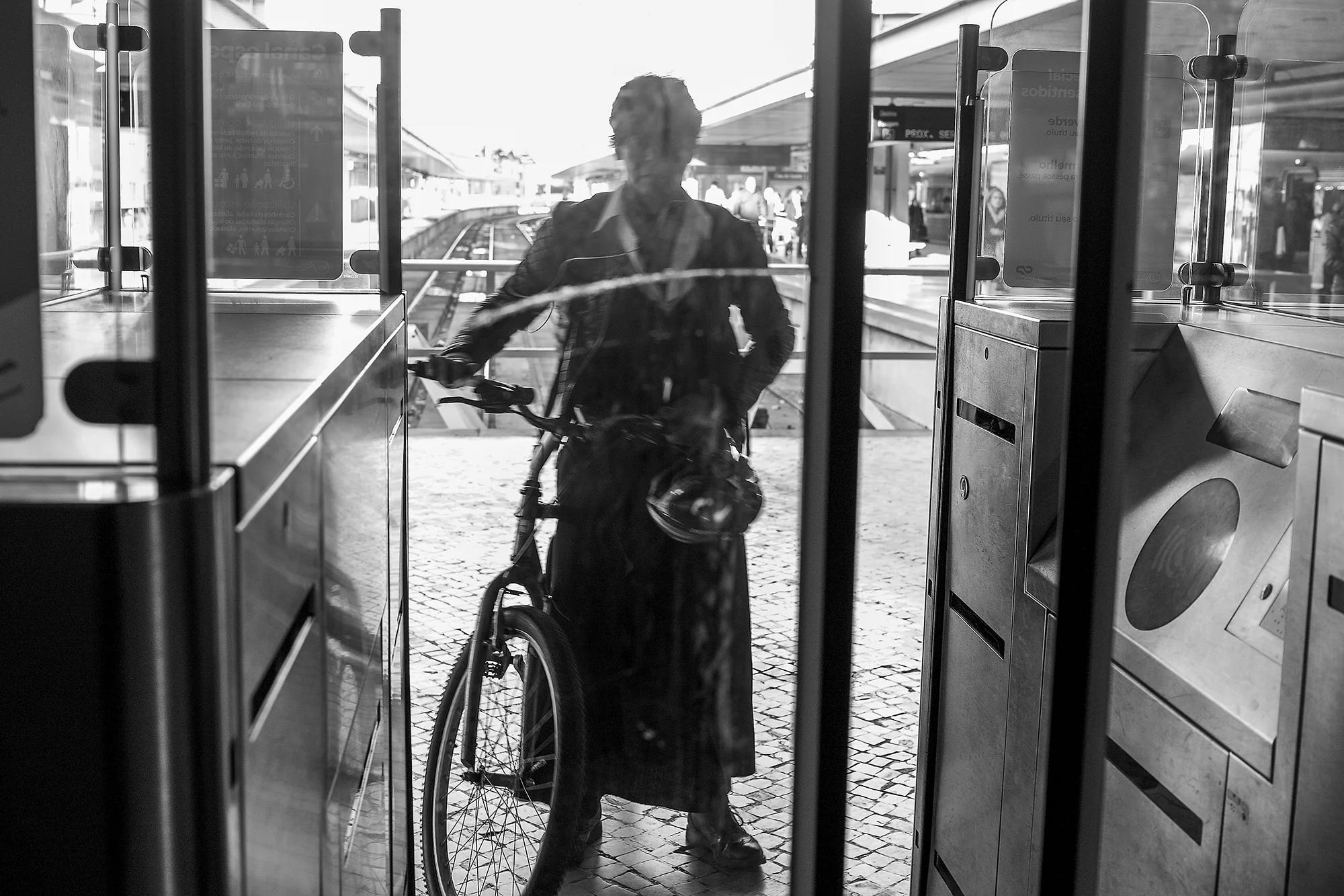 On my front a woman with a bicycle trying to go by a closed window door behind me a security guard seconds away to kick me out of the station. Photography can be fun allot of the times.
