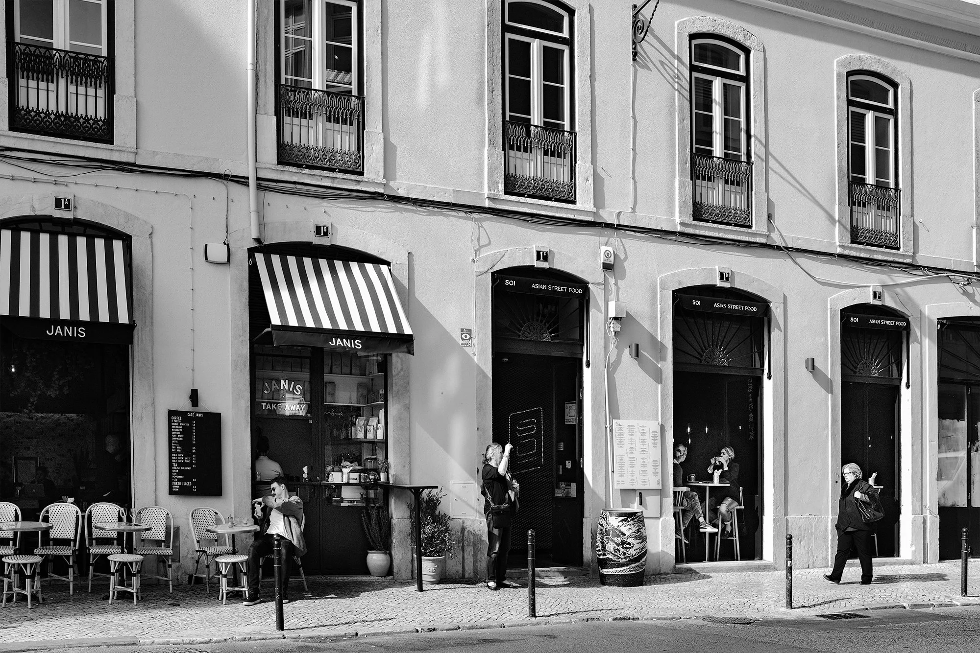 People in the terrace people taking pictures and people passing by at Rua da Moeda.