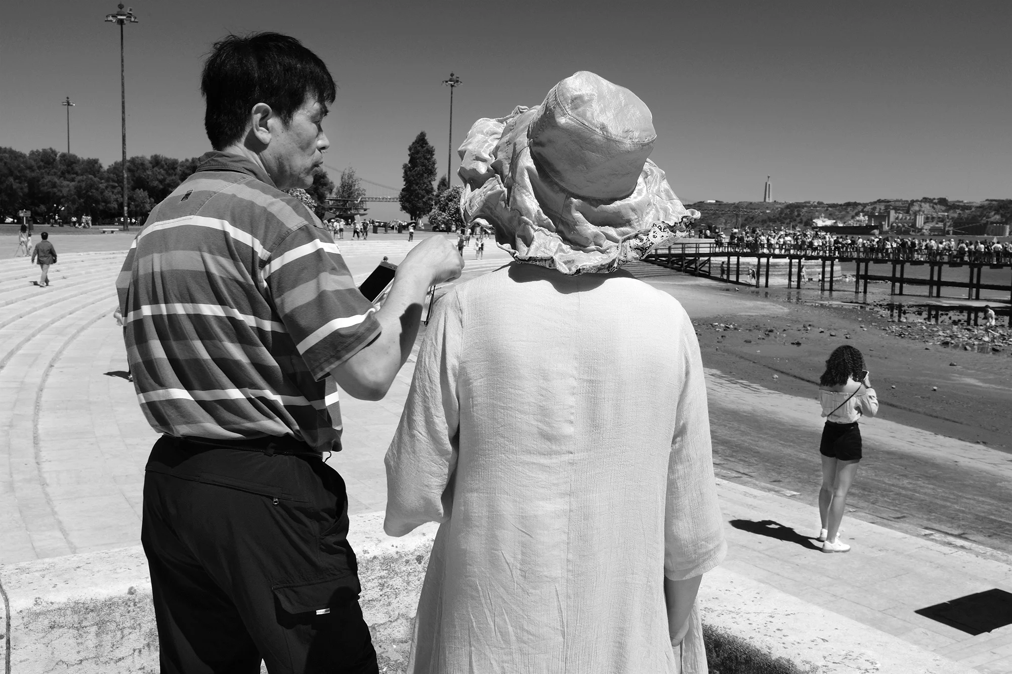 A couple in tower of Belém taking pictures with a celular phone and the woman with a peculiar hat.