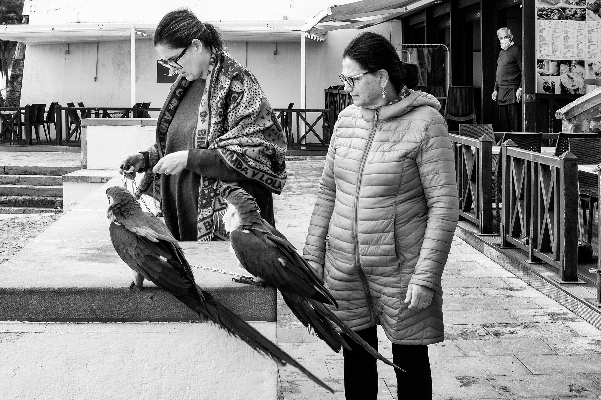 At the Duquesa beach two women with cokcatoos and macaws and a guy watching in the back.