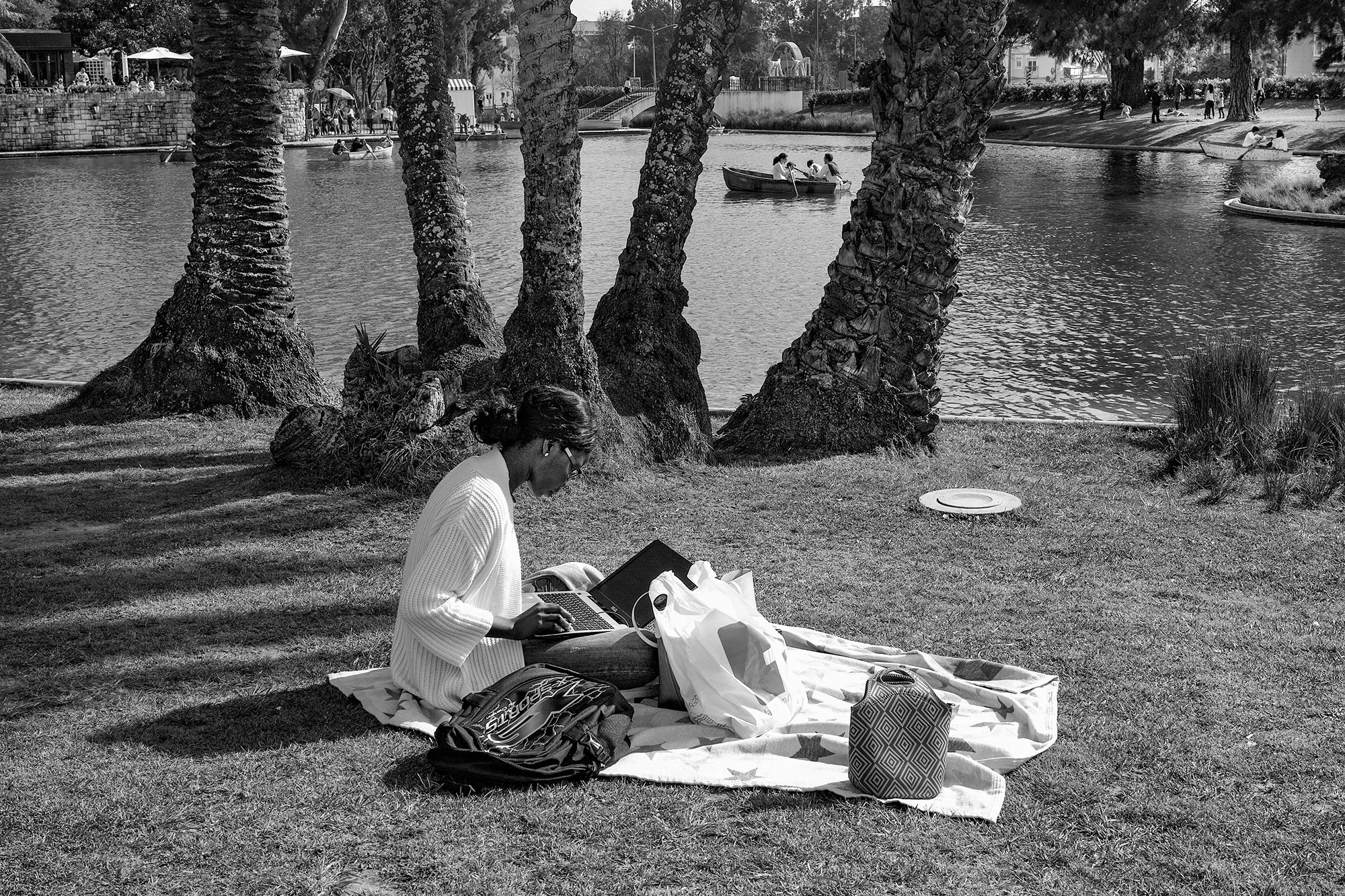 People at the grass of Campo Grande Garden and family rowing at the lake.